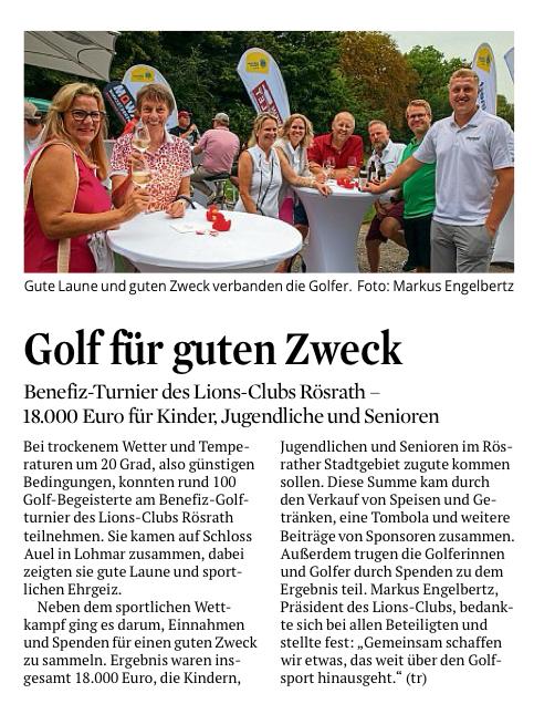 Am Samstag, den 16. August 2025, fand im traditionsreichen Golfclub Schloss Auel das 22. Benefiz-Golfturnier des Lions Club Rösrath statt. Unter dem Motto „Gemeinsam für Kinder, Jugendliche und Senioren in Rösrath“ gingen bei bestem Wetter 100 Golferinnen und Golfer an den Start.